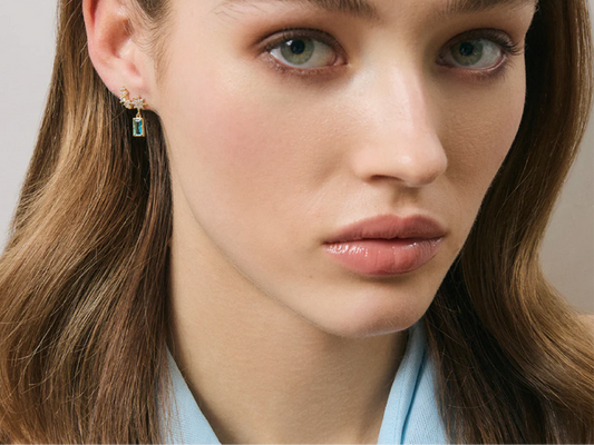 Huggie with Hanging Blue Topaz Baguette in 18KT Yellow Gold Plate