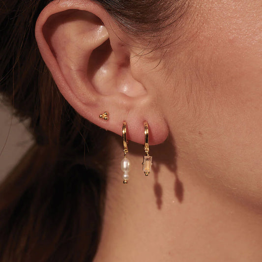 Huggie with Hanging Rose Quartz Baguette in 18KT Yellow Gold Plate