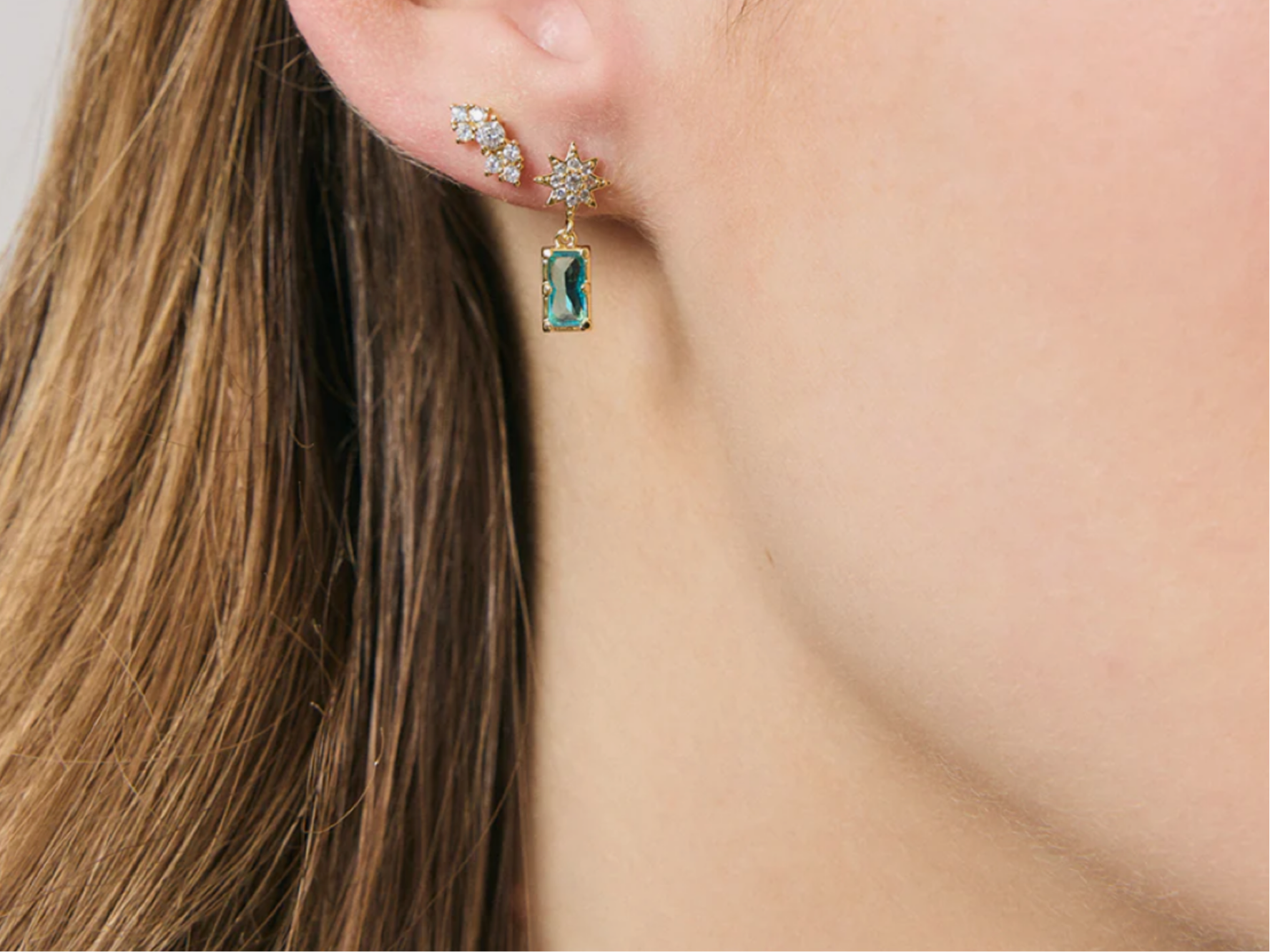 Elevate your style with Gretchen Studs. These star-shaped studs feature a stunning blue baguette stone that adds a touch of elegance to any outfit. Make a statement with these versatile and eye-catching earrings.