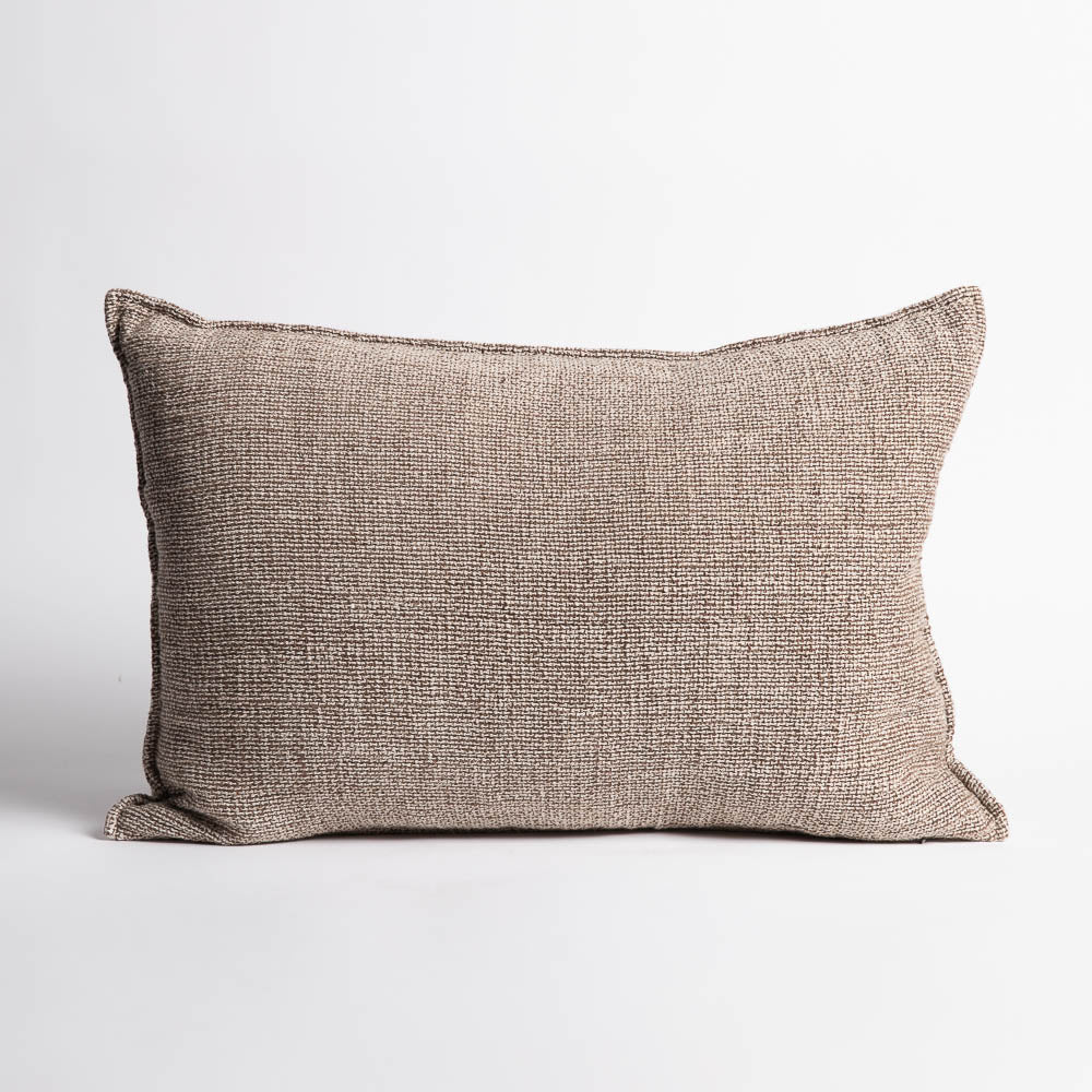 The Kenji Cushion offers a strong understated elegance with its neutral palette and refined details. Crafted from a linen/cotton blend, its yarn-dyed jacquard weave combines taupe and off-white yarns.